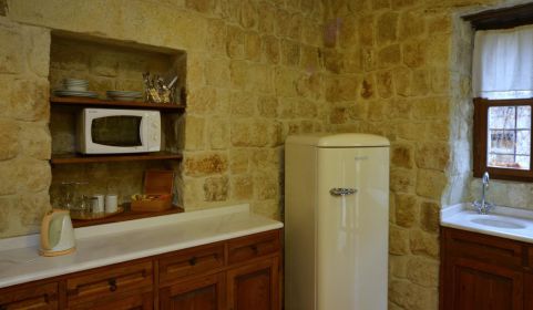 Bu evimiz ismini kaya odalarının önünde yer alan ikiz taş kemerlerden almaktadır. Evimizin iki kaya odası ve mutfağı içerden birbirlerine kilitlenebilir bir kapı ile bağlantılıdır. Her iki odasının ve mutfağının evin avlusuna açılan kapıları vardır. Odalardan bir tanesinde çift kişilik büyük karyola, diğerinde ise tek kişilik bir karyola ve oturma grubu vardır. Her iki odanın da ayrı banyosu bulunmaktadır. Evde yemek yapmak için tam donanımlı bir mutfak bulunmaktadır. Arabanız için evin girişinde özel park yeri vardır.